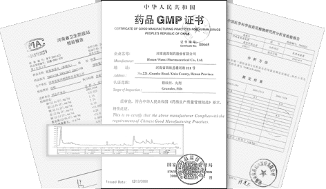 Henan Wanxi Pharmaceutical Factory has established a base for producing genuine materia medica in a form of integration of the supplier, base, and peasant household, so as to ensure a high content of the effective composition of the drugs, containing no pesticide residues and heavy metals. For production of the drugs, the factory persists in the principles "labour can not be saved though the processing of drugs is comated, and the quality of the materia medica should be quaranteed though the materia medica is expensive". Only by doing so, can the superiority of resources be transformed into the superiority of products. Further more producing in GMP-Standardized Workshops with Modern Processes Wanxi Pharmaceutical Factory is the largest base for producing the concentrated pills and granules in China. It has a history of twenty years for producing the concentrated pills and granules with unique pharmaceutical technology. The concentrated pills made by the factory are round in shape with shiny appearance, and the intrinsic quality is much better than the same procuts made by the other factories. The concentrated pills, a modern preparation of Chinese herbal drugs, is made by extracting the effective compositions of Chinese herbal drugs with the advanced extraction equipment, followed by concentrating the extract into light paste by cryogenic freezing, pelletizing the mixture of the light paste (as the adhesives) and the powder of crude drugs, and then drying the pills by microwave. The programme control, automatic detection, pipeline transfer, and mechanized packing are basically realized. The entirely enclosed extraction, pelletization, and storage are adopted for producing the concentrated granules with fully automatic production line in the GMP-standardized workshops. The company hase set up a quality guarantee system for which the general manager is the person in charge. All the products are manufactured according to the national GMP standards and the national drug standards, and detected by ultraviolet Japan spectrophotometer UV260, dual-wavelength TLC scanner and high performance liquid chromatograph HPLC 1100 from the United States, and other precise instruments; and what is more, the company has set up a series of standards which are higher than the national standards so as to ensure highest quality of the products. |